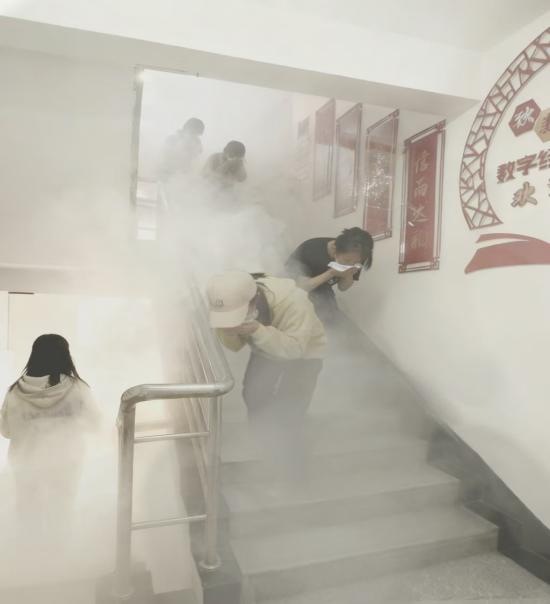 随着烟雾弹在公寓二楼引燃,浓烟裹挟着警示气息迅速弥漫楼道,消防演练正式启动。一时间,楼层引导员即刻就位,清晰指令引导疏散,同学们闻声而动,迅速用湿毛巾严密捂住口鼻,弯腰低姿,沿着预设路线稳步前行。撤离过程紧张而有序,仅用时数分钟便完成全员疏散,参与师生按要求抵达楼下指定集合区域,展现出良好的应急素养与协作精神。