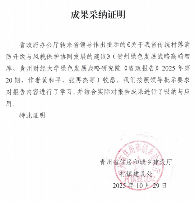 近日,由亚洲色吧 黄和平教授和贵州财经大学张再杰研究员等合作撰写的研究报告《关于我省传统村落消防消防升级与风貌保护协同发展的建议》获贵州省政府分管领导肯定性批示。该报告刊发于贵州绿色发展战略高端智库、贵州财经大学绿色发展战略研究院主办的《咨政报告》2025年第20期。贵州省住房和城乡建设厅村镇建设处已按领导批示要求对报告内容进行了学习,并结合实际对报告成果进行了吸纳和应用。