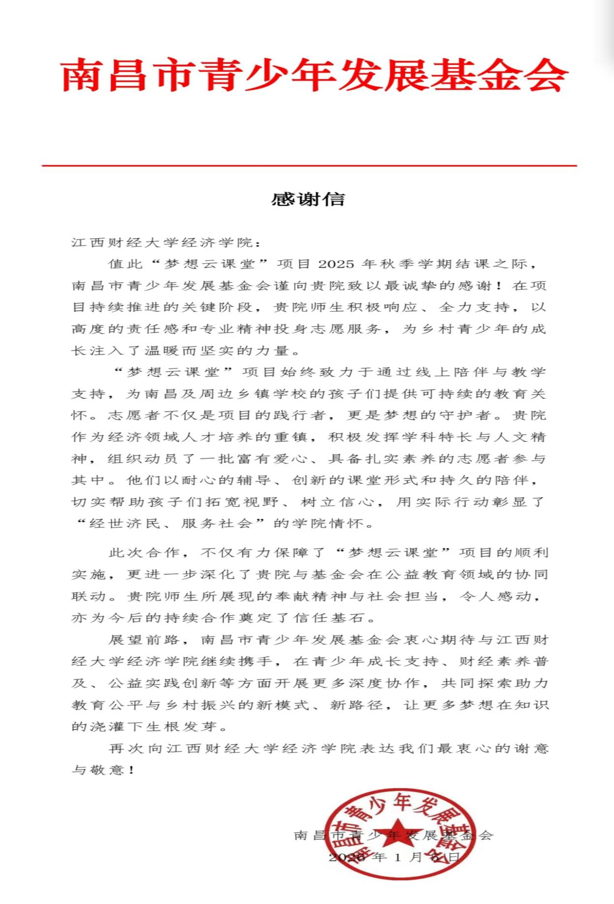 当专业知识的星火,遇见乡村少年的憧憬,一场关于成长的双向奔赴,在2025年的“梦想云课堂”里悄然绽放。2026年1月5日,亚洲色吧 收到南昌市青少年发展基金会发来的感谢信,字里行间的肯定,是这个冬日里最温暖的回响。